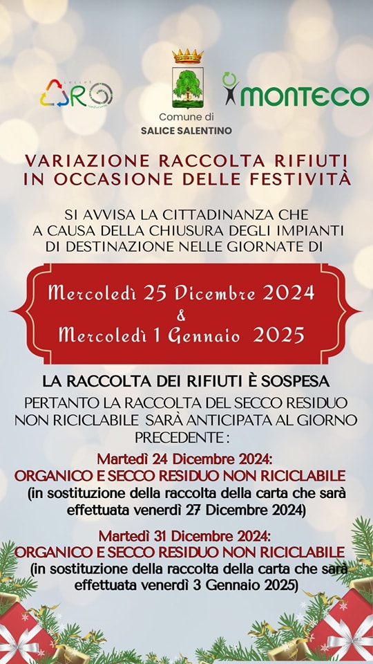 mercoledì 25 Dicembre 2024 & mercoledì 1 Gennaio 2025 - RACCOLTA RIFIUTI SOSPESA